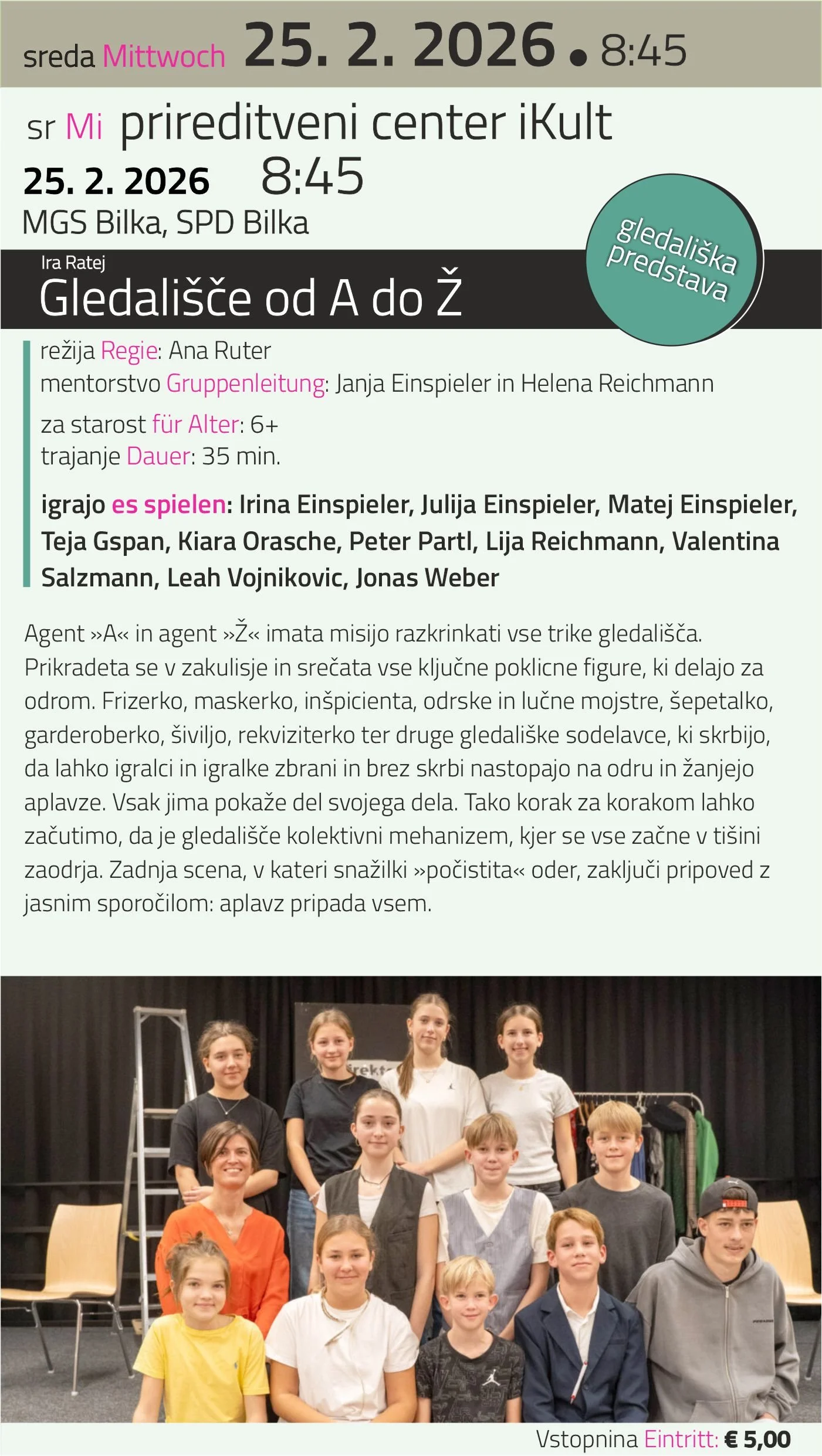 Gledališče od A do ž Mittwoch, 25. Februar 2026 08:45 09:20 iKult Südbanhgürtel 24 Klagenfurt Österreich (Karte) Google Kalender ICS