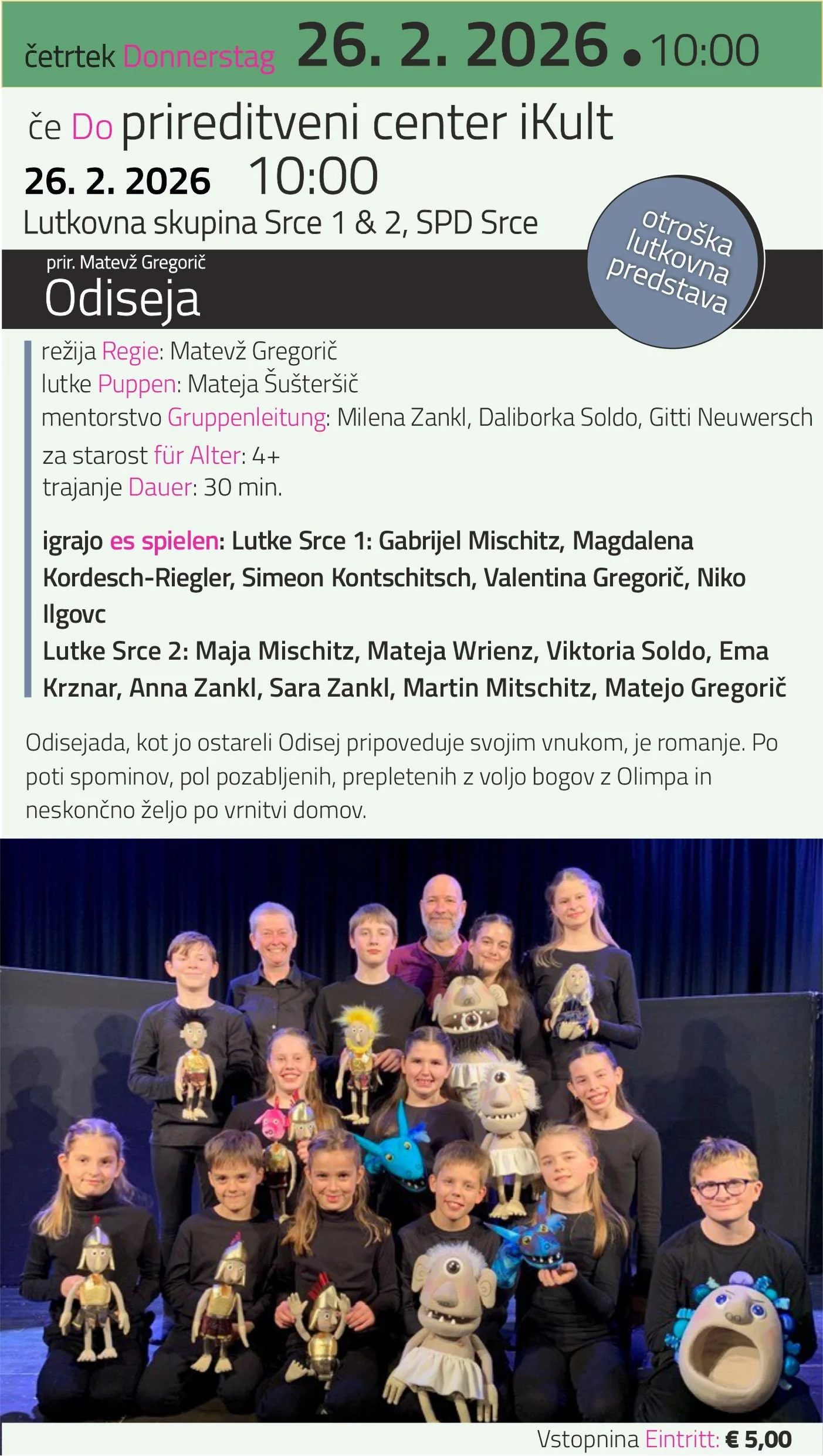 Odiseja Donnerstag, 26. Februar 2026 10:00 10:35 iKult Südbanhgürtel 24 Klagenfurt Österreich (Karte) Google Kalender ICS