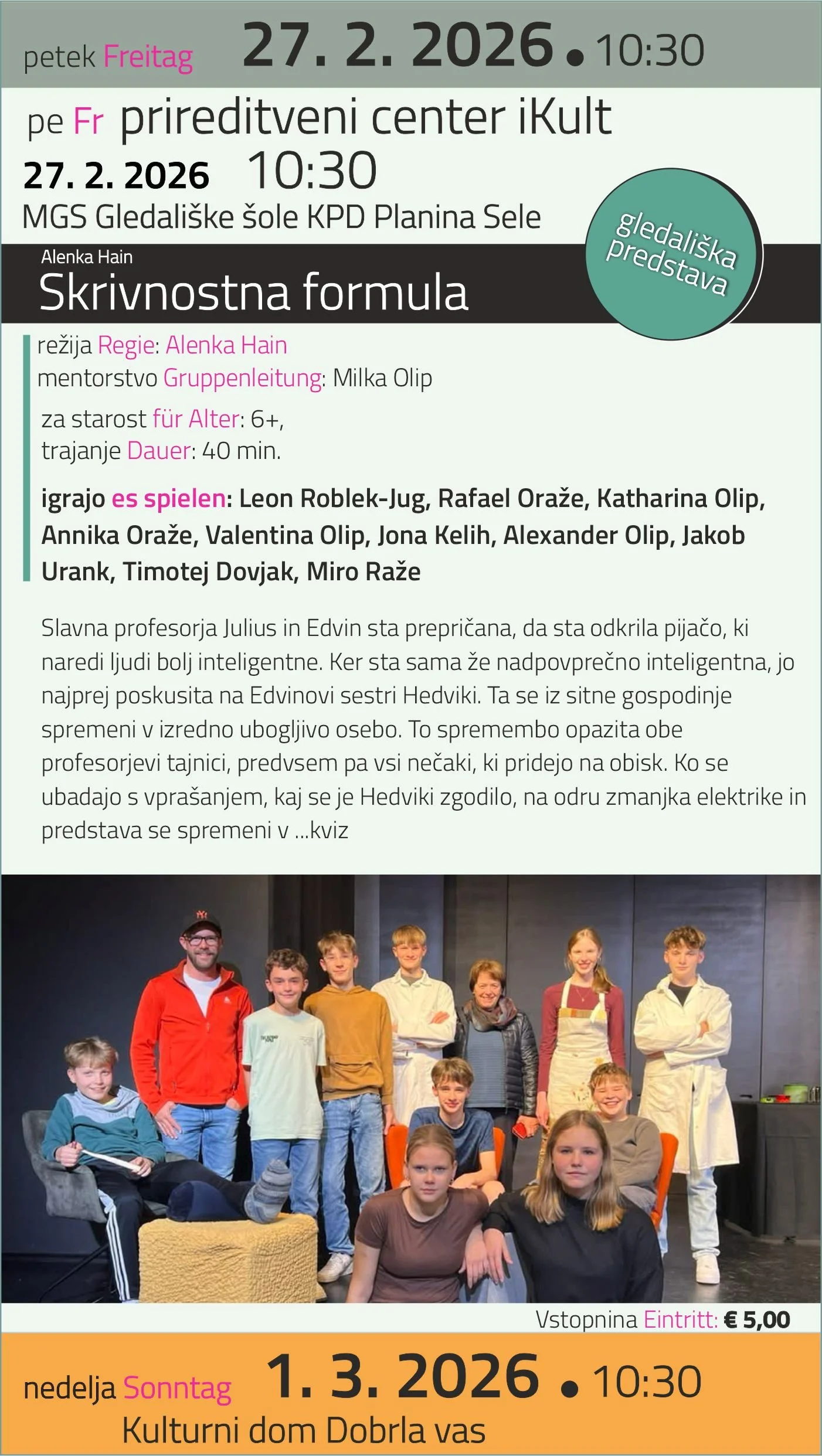 Skrivnostna formula Sonntag, 1. März 2026 10:30 11:10 Kulturni dom Dobrla vas Bleiburger Straße 6 Eberndorf, Kärnten, 9141 Österreich (Karte) Google Kalender ICS