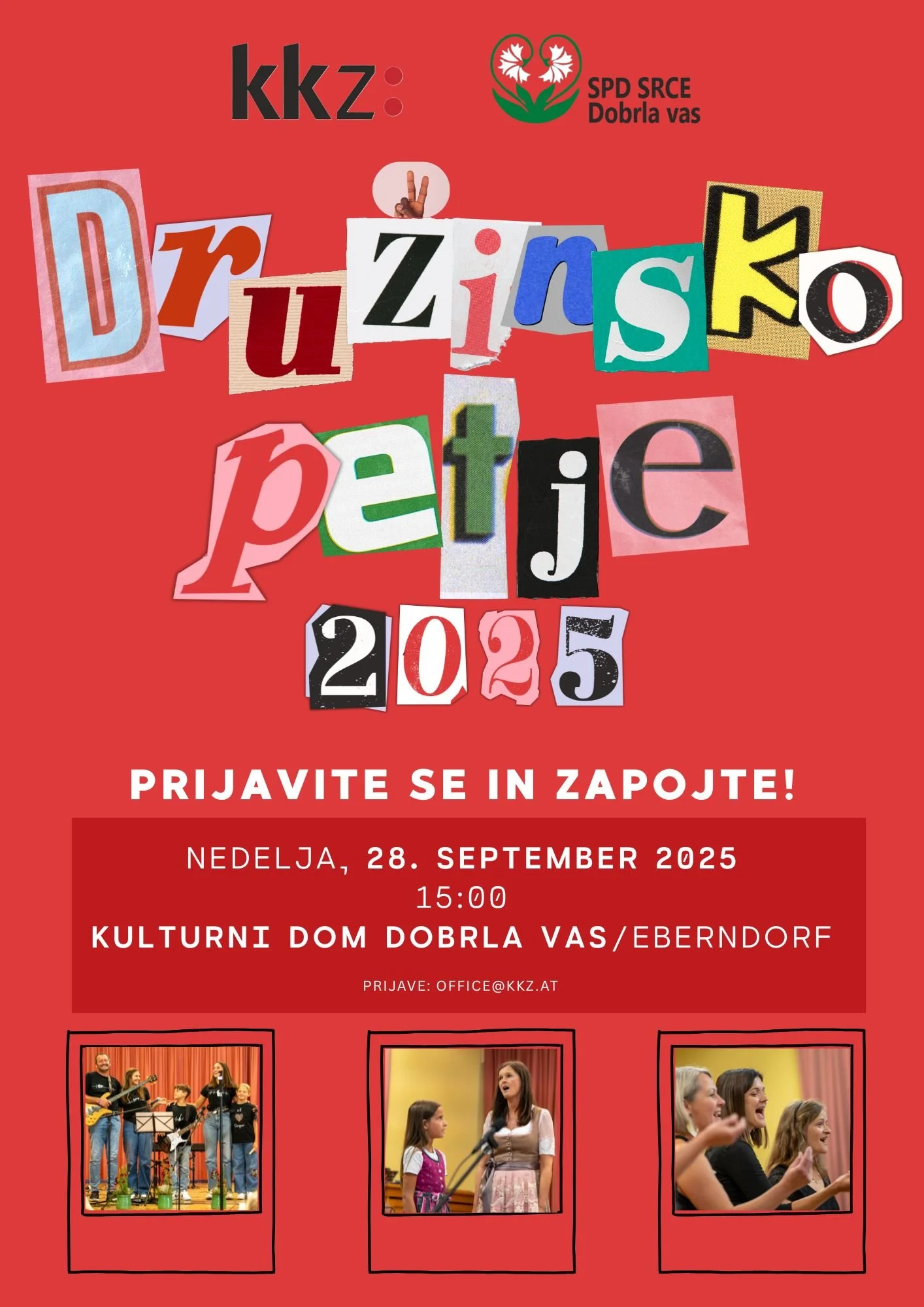 V sodelovanju s SPD Srce iz Dobrle vasi organiziramo v nedeljo, 28. septembra 2025, koncert družinskega petja. Prijavite se in zapojte s svojo družino! Veselimo se vas!