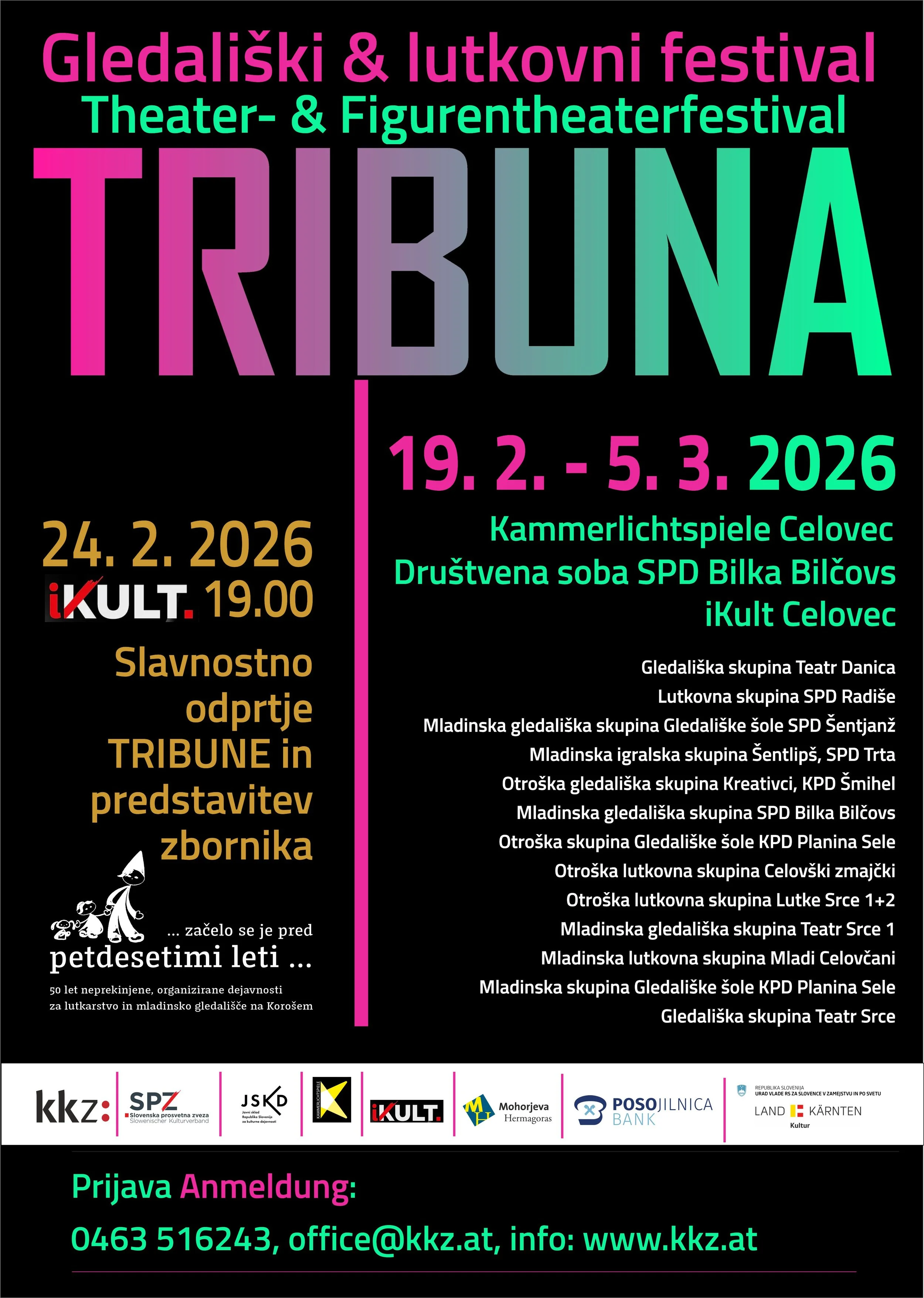 Festival TRIBUNA, bo potekal od četrtka, 19. februarja do četrtka 5. marca 2026 v Kammerlichtspiele, v prireditvenem centru iKult v Celovcu, v društveni sobi SPD Bilka v Bilčovsu, v Kulturnem domu v Dobrli vasi in na Višji šoli za gospodarske poklice v Šentpetru in je poklon slovenski gledališki dejavnosti na Koroškem. V okviru festivala bo predstavljen zbornik … začelo se je pred petdesetimi leti …, ki je izšel ob 50. jubileju neprekinjene organizirane dejavnosti za lutkarstvo in mladinsko gledališče na Koroškem.